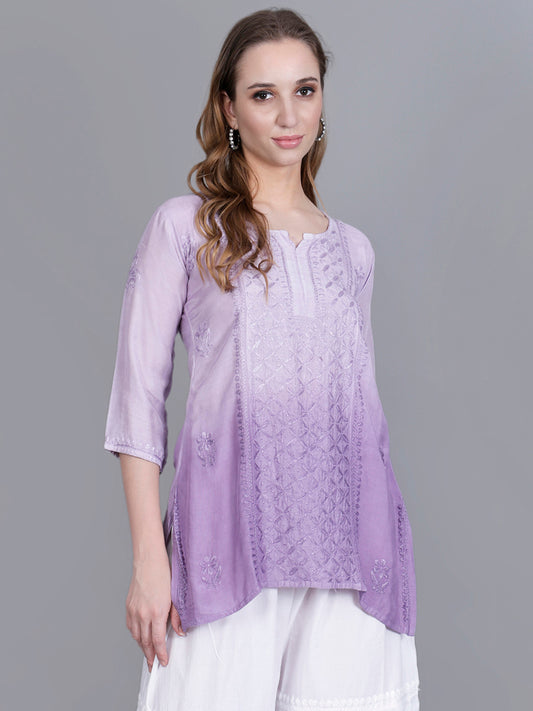 The Chikankari Story Womenโs Hand-Embroidered Short Kurti with Fine Lucknowi Panel Work โ Ombre Shades in Purple, Green, Brown, Powder Blue & Onion Red.