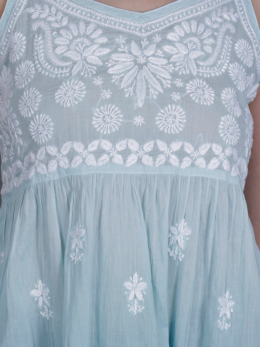 The Chikankari Story Handcrafted Sleeveless Chikankari Mul Cotton Top with Intricate White Floral Embroidery in Ombre Shades โ Light Blue, Sea Green, Light Peach, Light Purple, Light Pink & Light Yellow.
